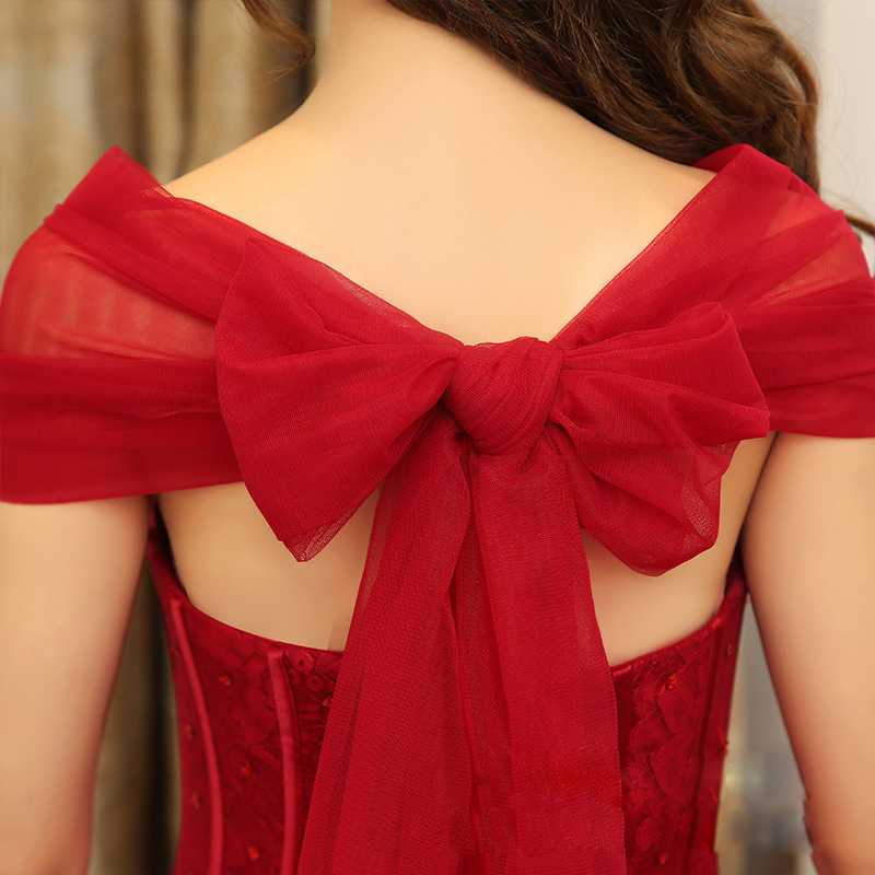 红色一字肩新娘敬酒服