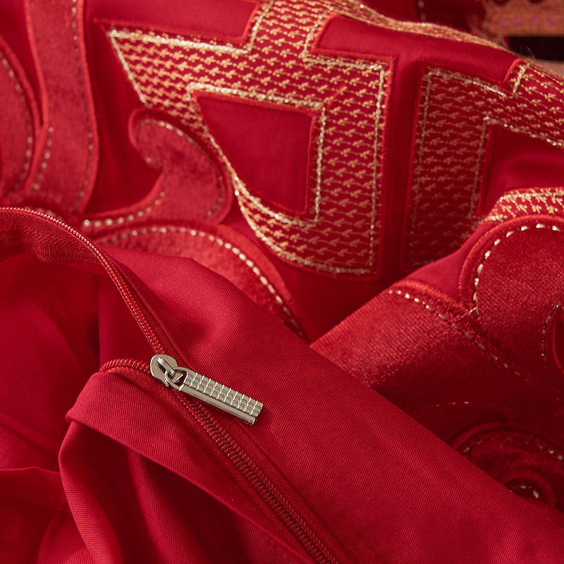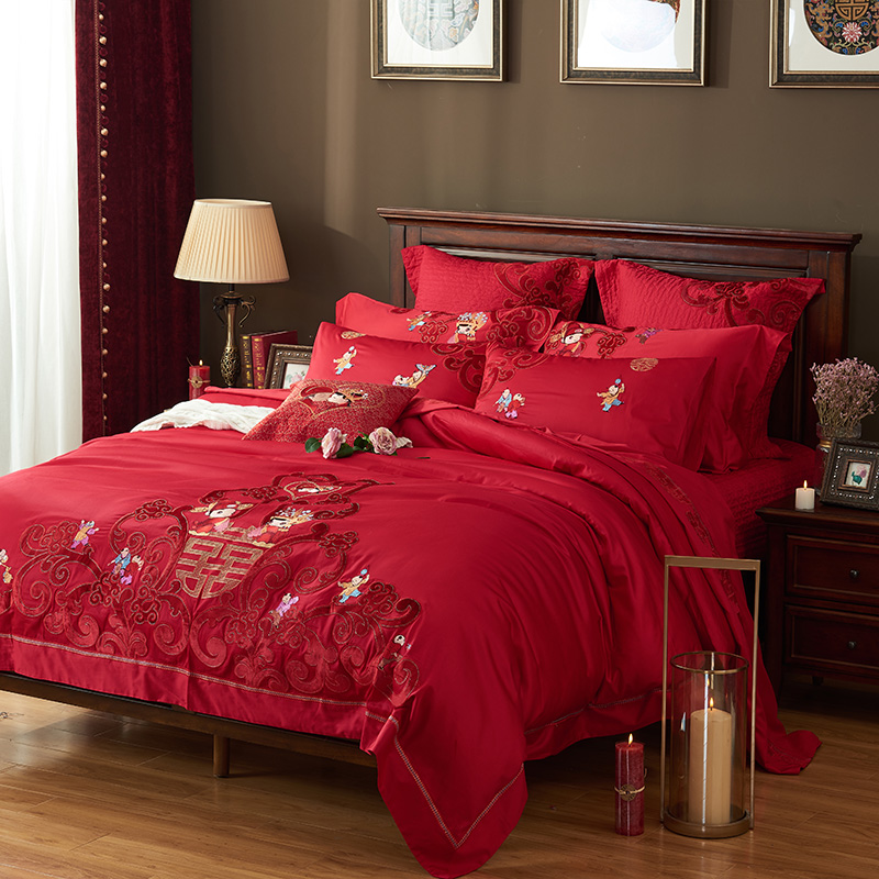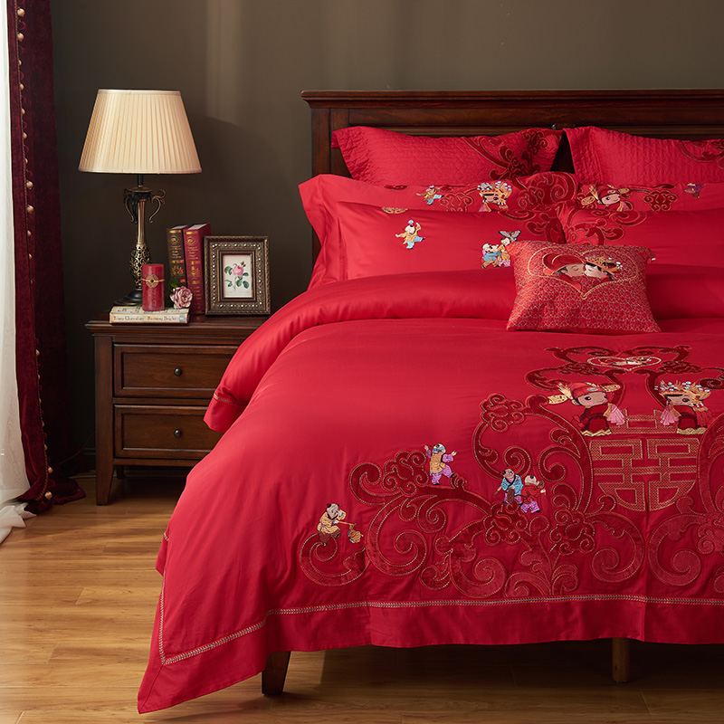 《新婚燕尔》新郎家大红色喜字刺绣图案结婚床上用品四件套贺新婚之喜
