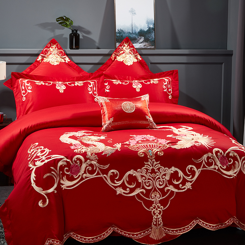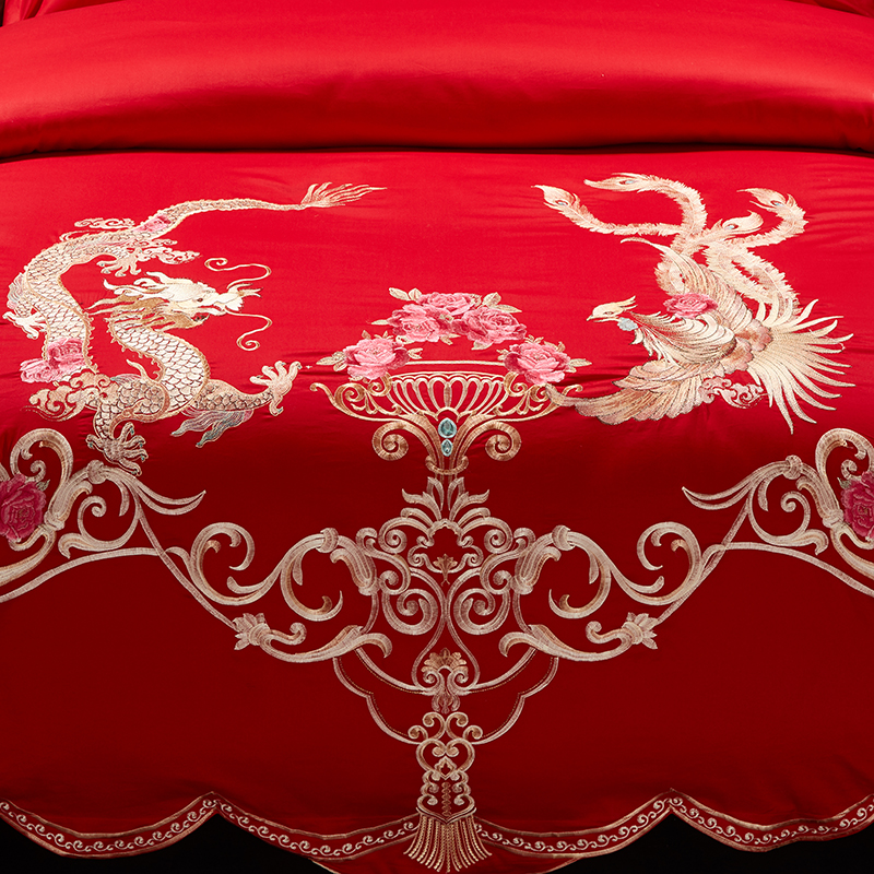 《龙腾喜悦》新郎家大红色喜字刺绣图案结婚床上用品四件套龙凤大典