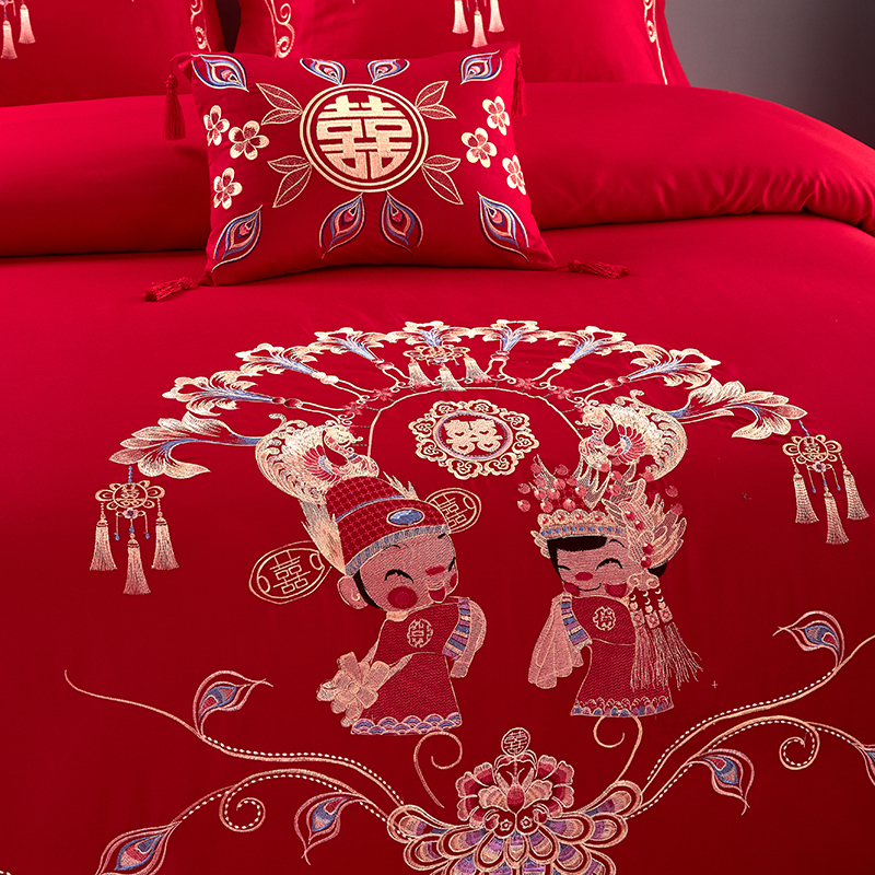 《天地贺喜》新郎家大红色喜字刺绣图案结婚床上用品四件套佳偶天成偕老