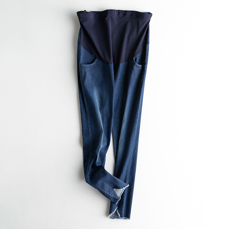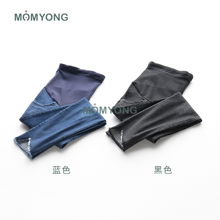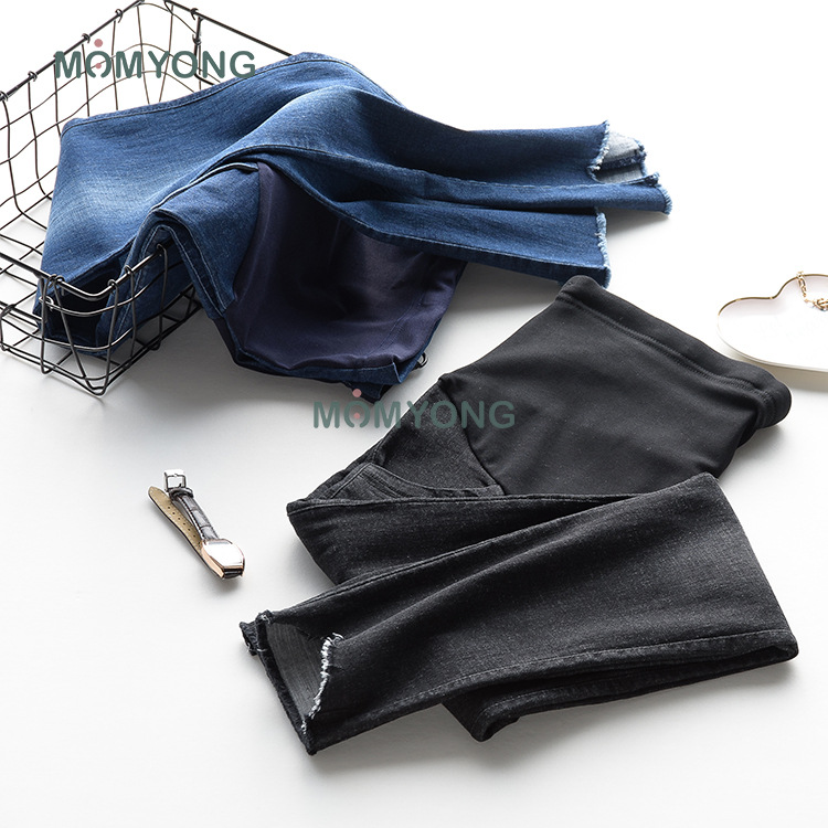 健康牛仔面料高腰托腹,调节带设计,不伤肌肤。裤长,九分裤微弹