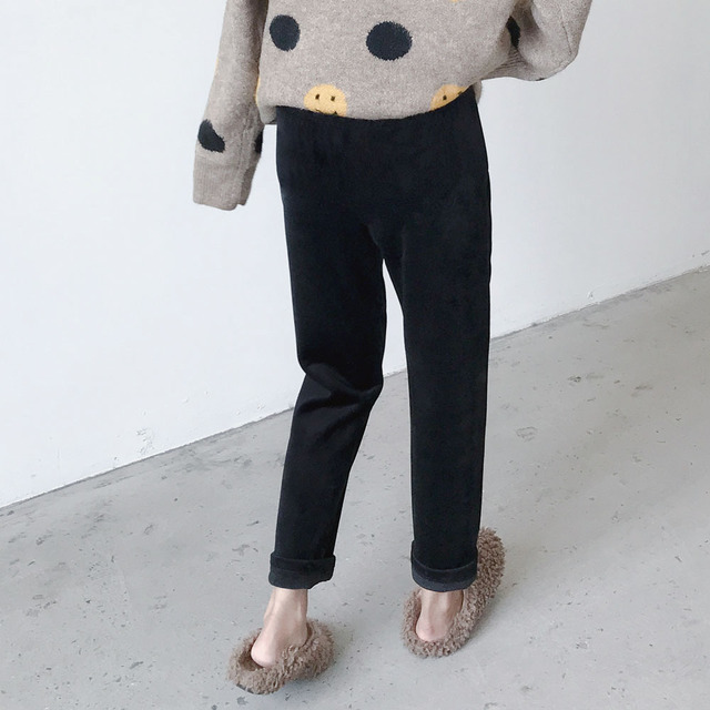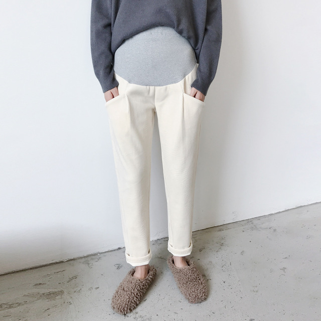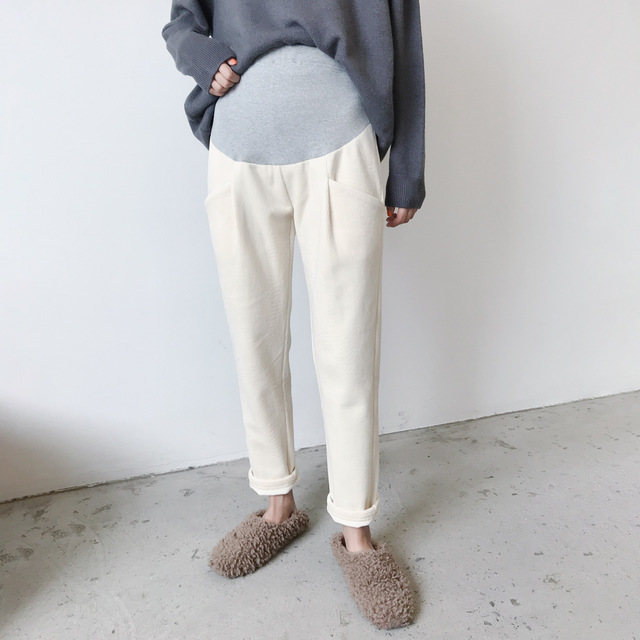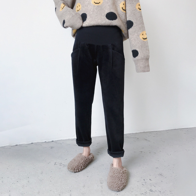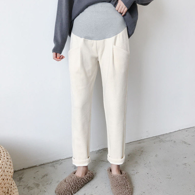 条纹灯芯绒面料孕妇直筒裤托腹裤,冬季韩版加绒加厚百搭显瘦工装裤