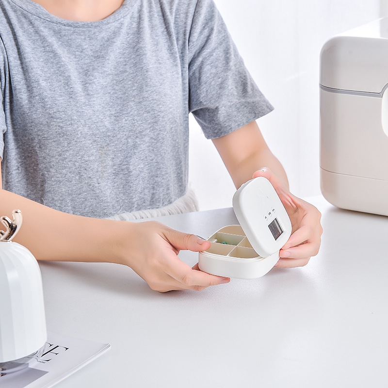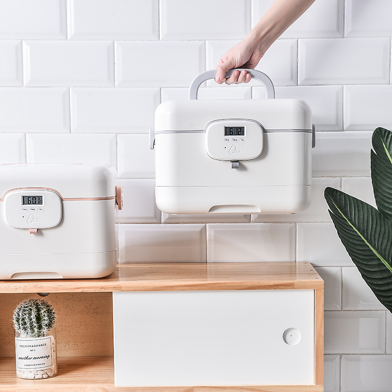 定时提醒吃药功能,内部大容量分层分隔方便储藏药品,手提设计外观时尚