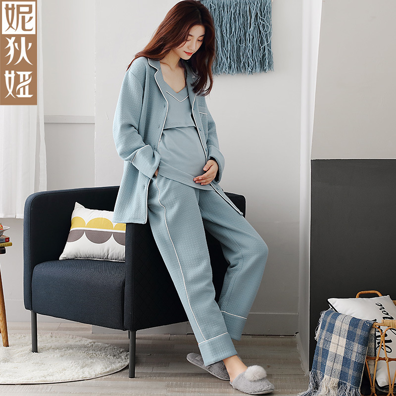 品牌纯棉空气夹层孕妇睡衣吊带产后哺乳秋冬月子服3件套装