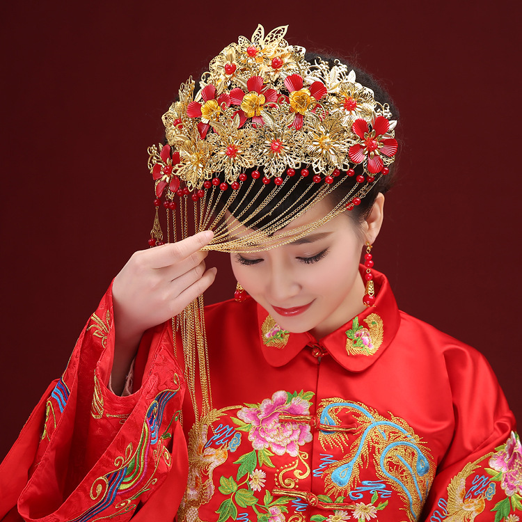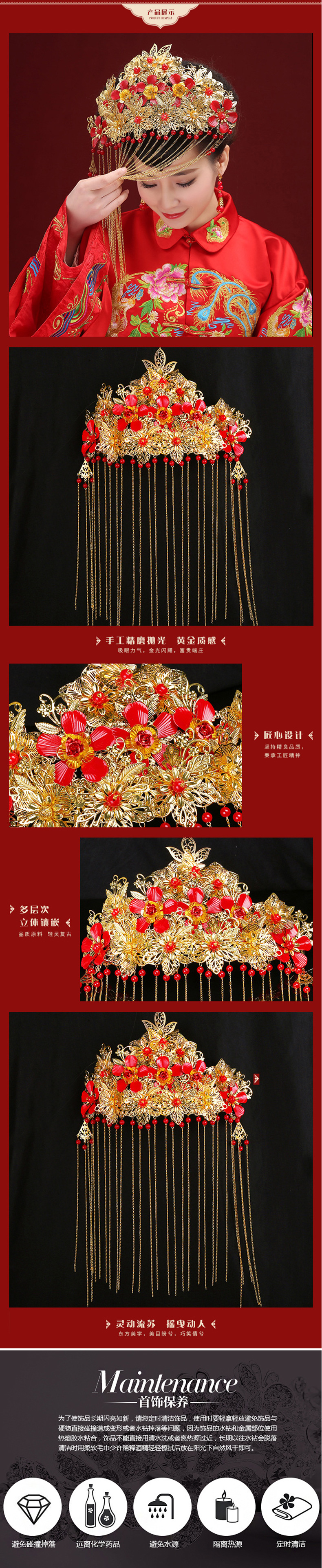 中式新娘头饰 古装发饰金属皇冠 喜庆中式龙凤褂头饰凤冠--聚爱城