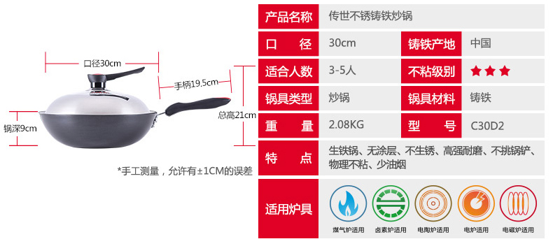 炊大皇传世铸铁无涂层炒菜锅30cm--聚爱城