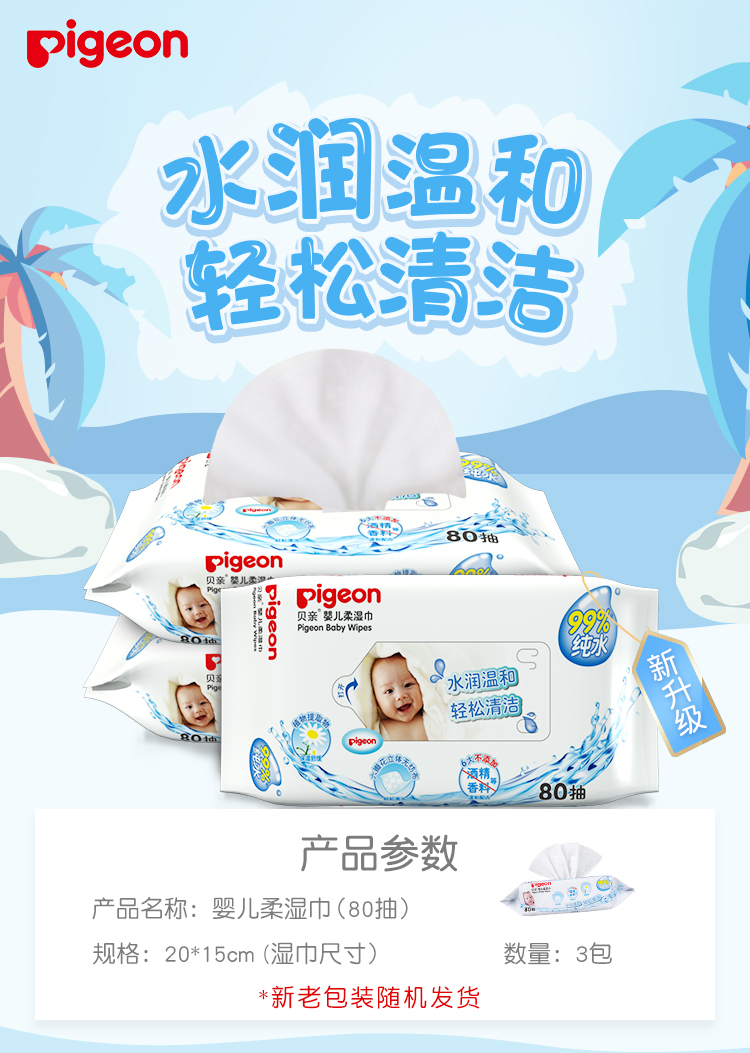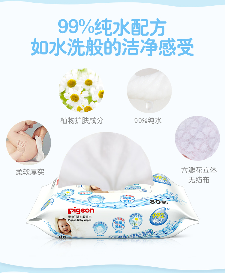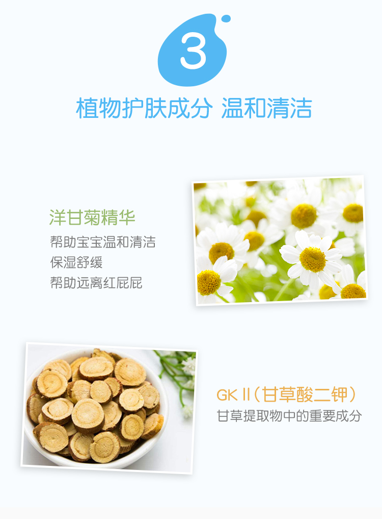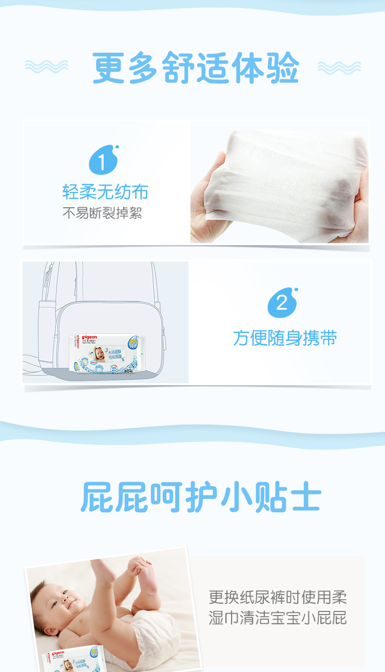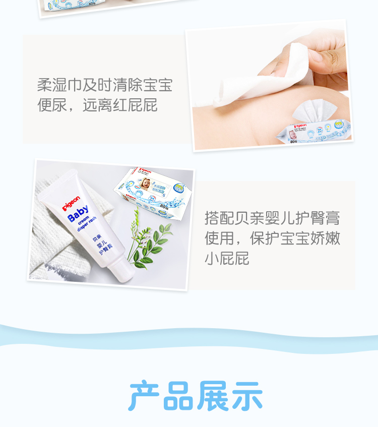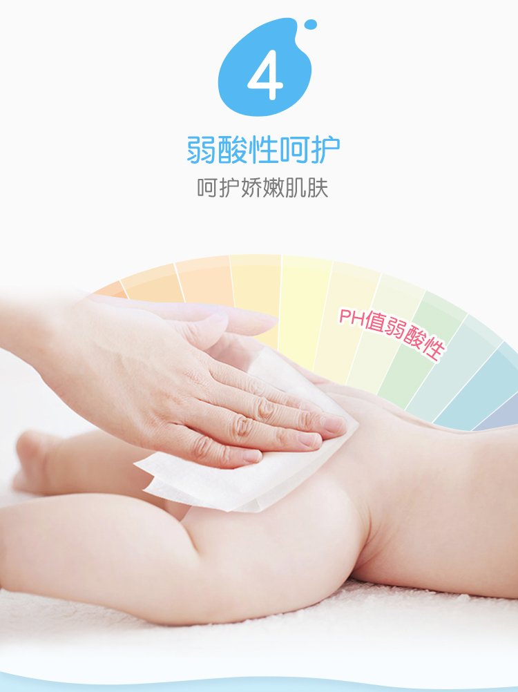 如水情景般的洁净感受,无刺激添加,易于清洁屁屁褶皱处 呵护婴儿小屁屁