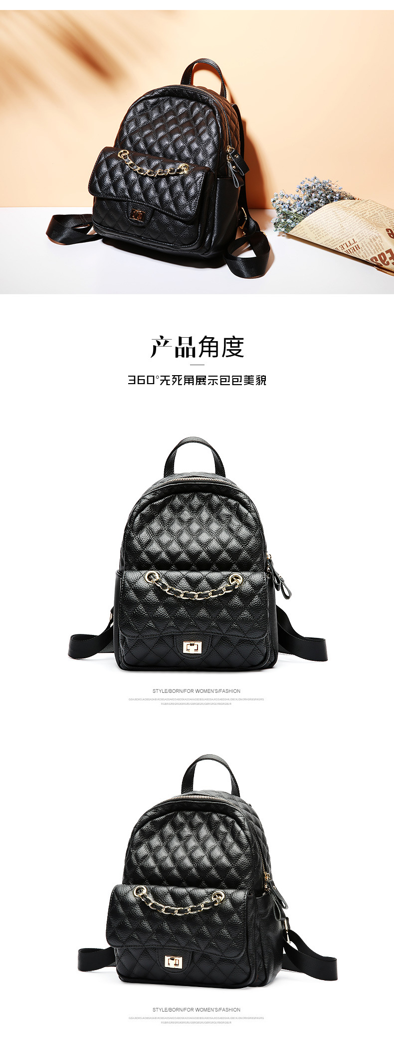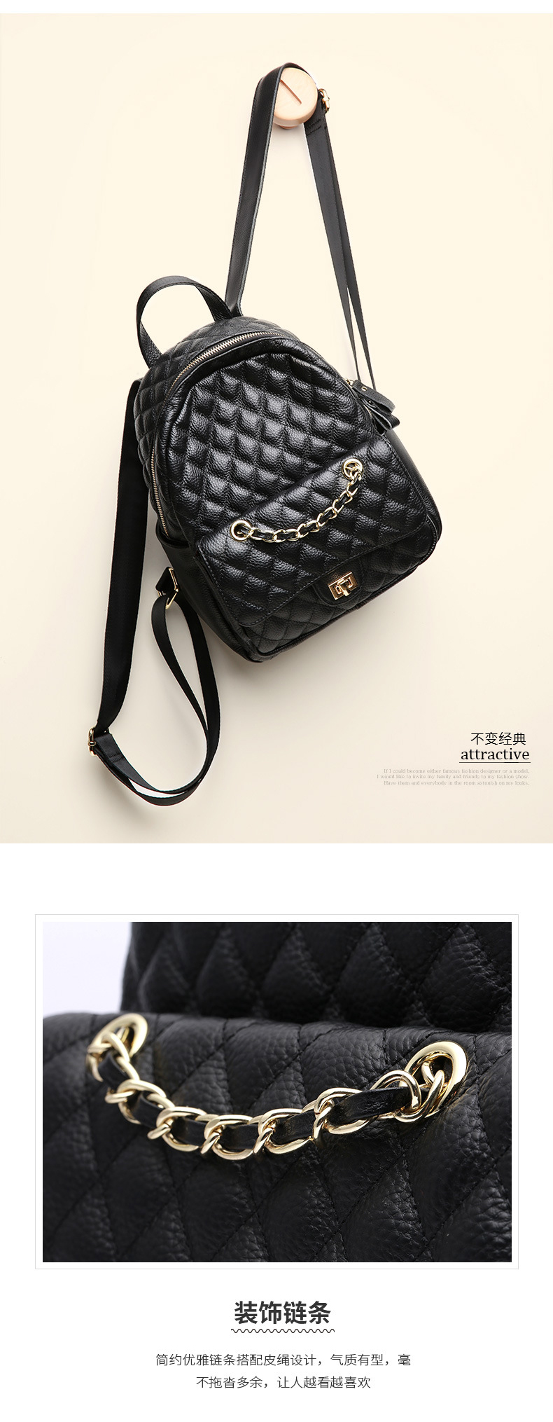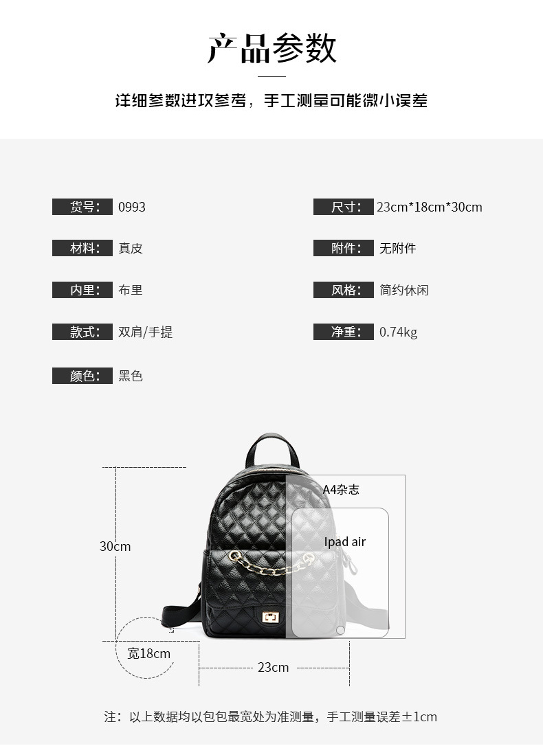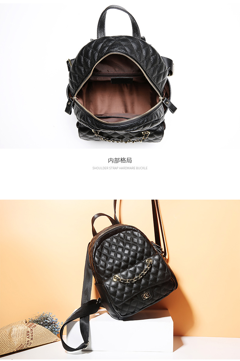 【黑色】真皮小香风菱格双肩包时尚小背包