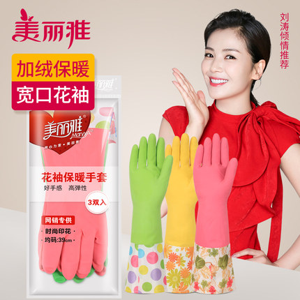美丽雅花袖保暖手套3 双装家务加绒