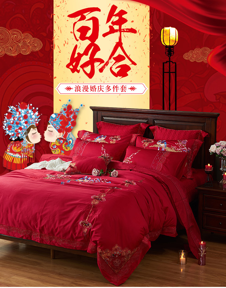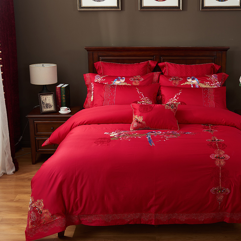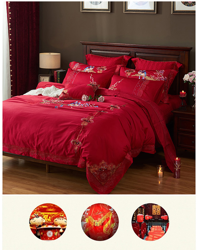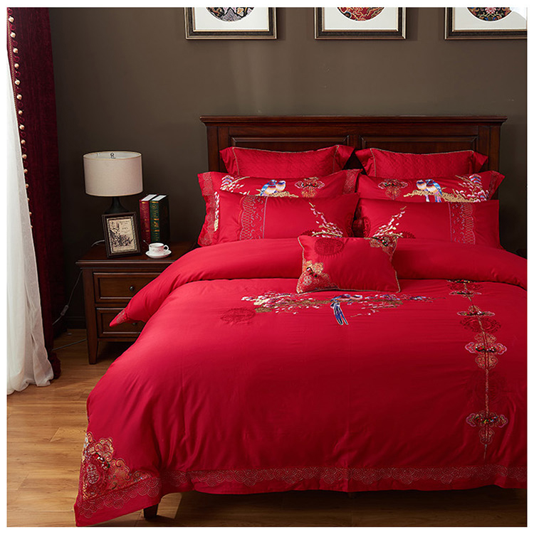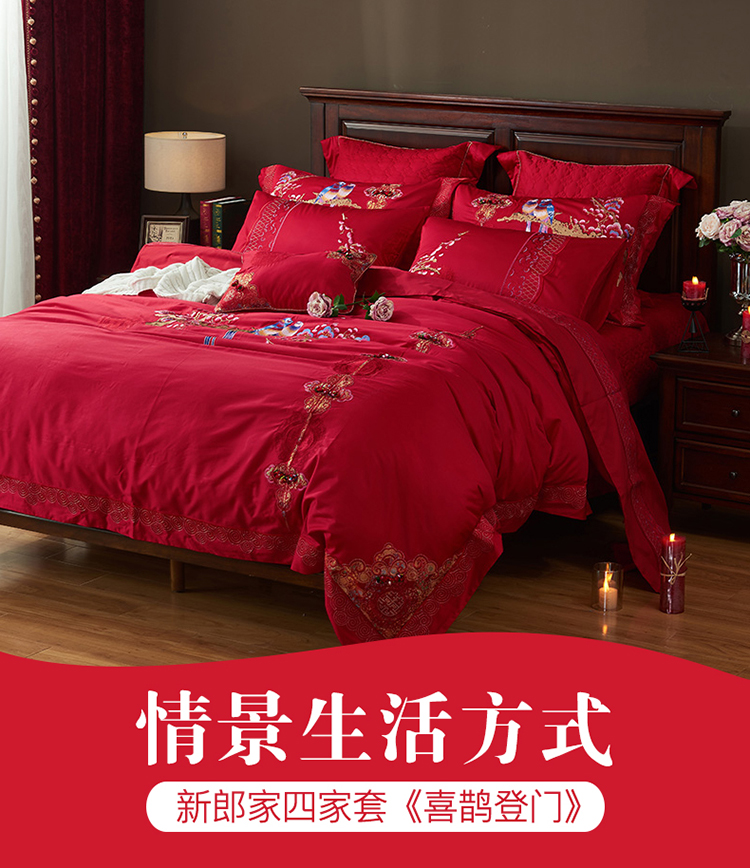 《喜鹊登门》新郎家大红色喜字刺绣图案结婚床上用品四件套喜上眉梢--聚爱城