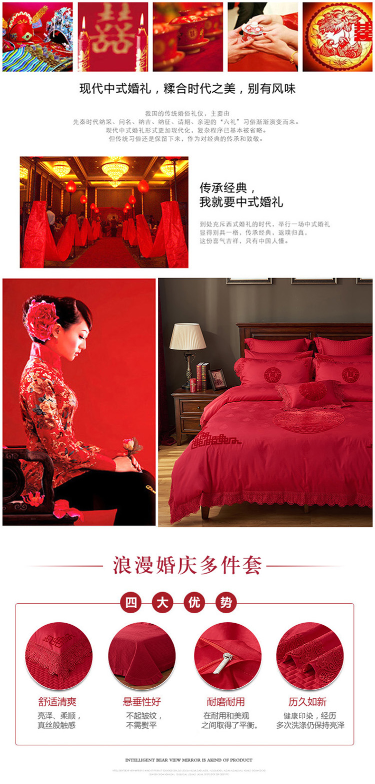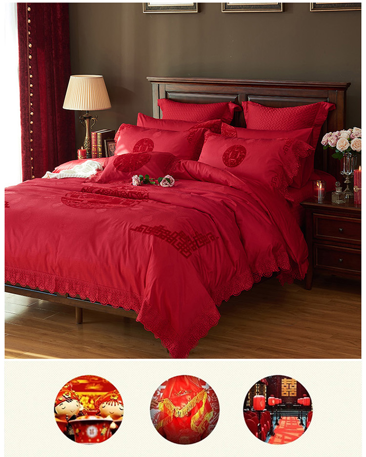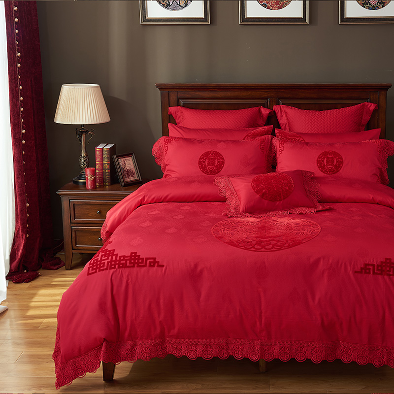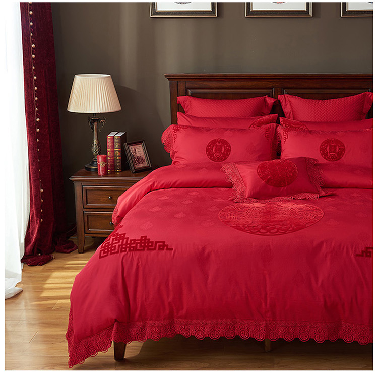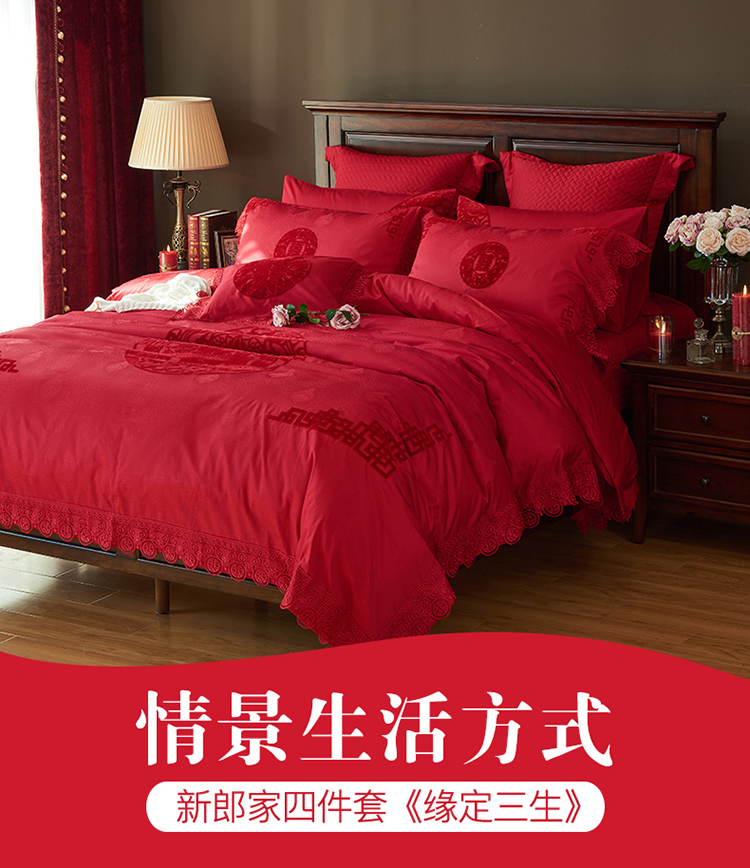 《缘定三生》新郎家大红色喜字刺绣图案结婚床上用品四件套喜上眉梢