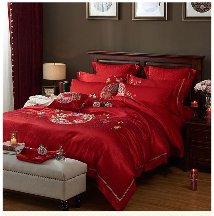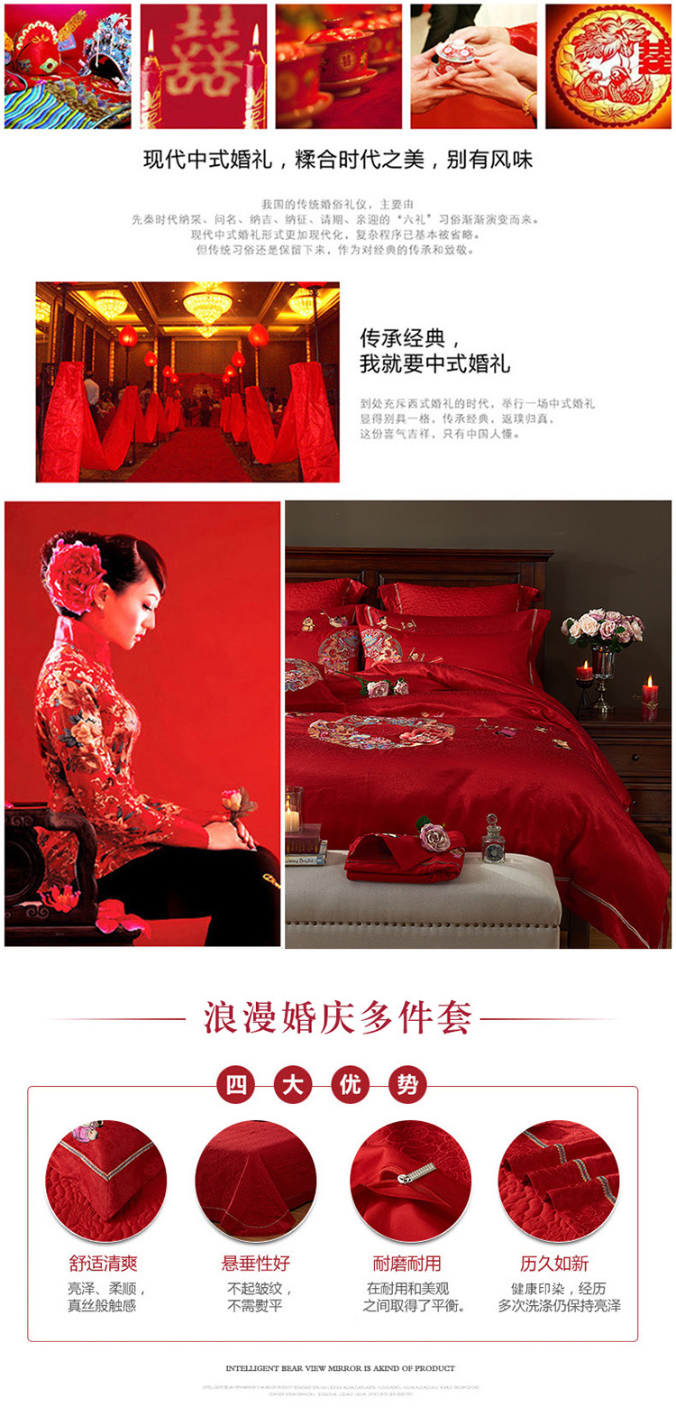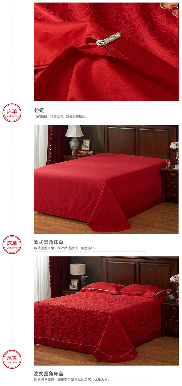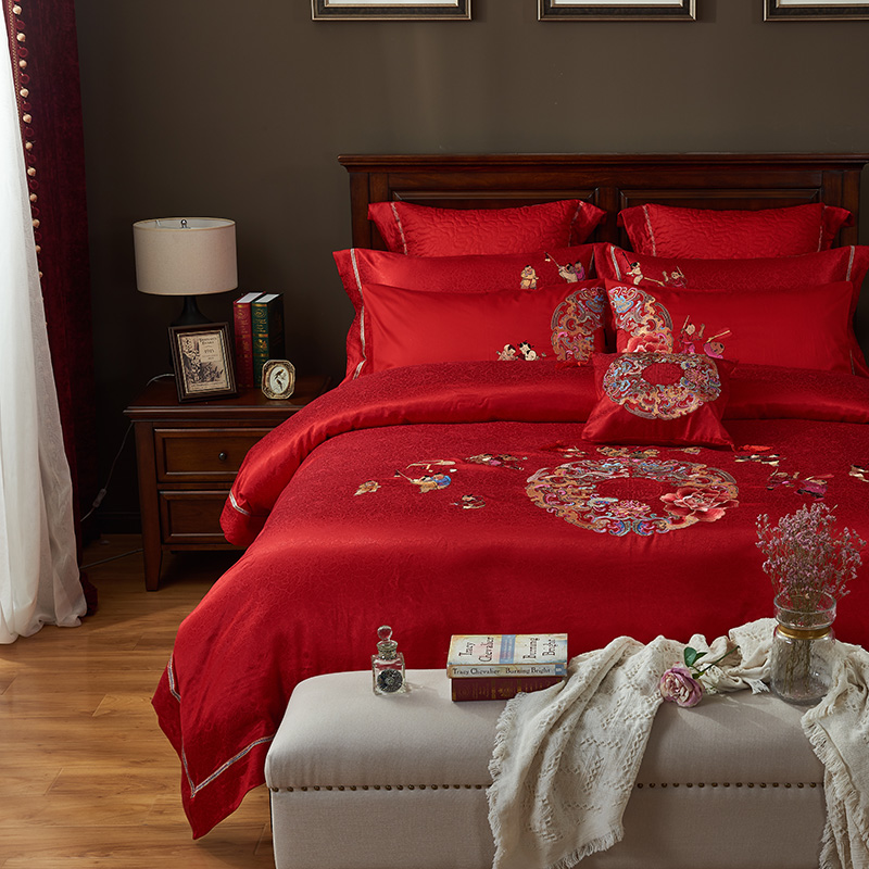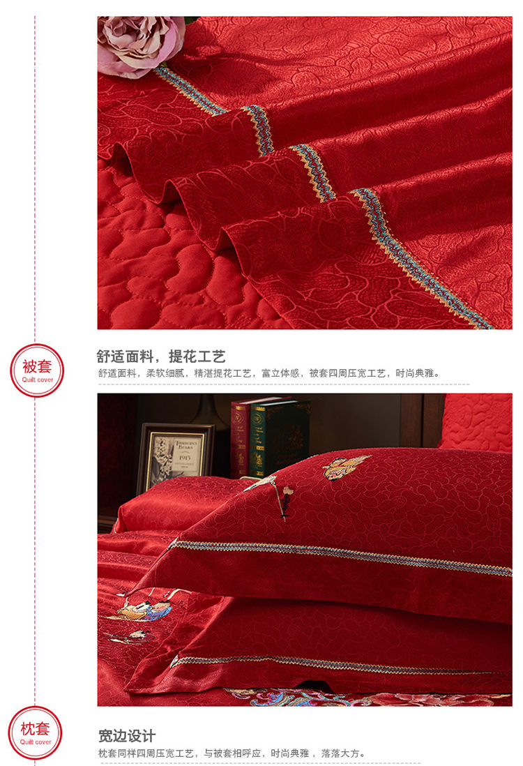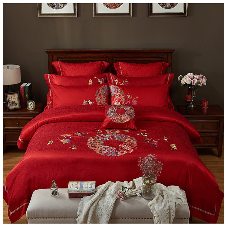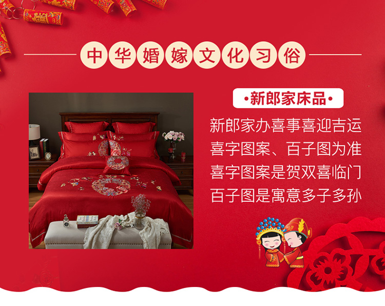 《百子纳福》新郎家大红色喜字刺绣图案结婚床上用品四件套多子多孙