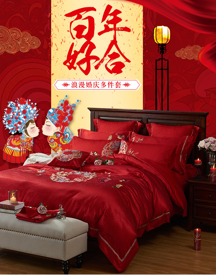 《百子纳福》新郎家大红色喜字刺绣图案结婚床上用品四件套多子多孙--聚爱城