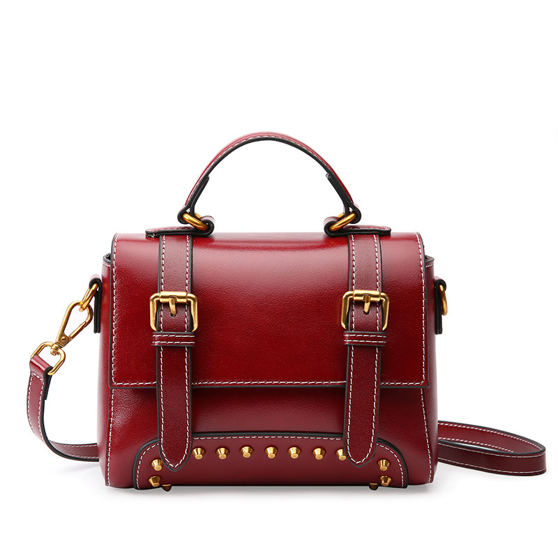 【酒红色】复古风牛皮手提女单肩斜挎小方包