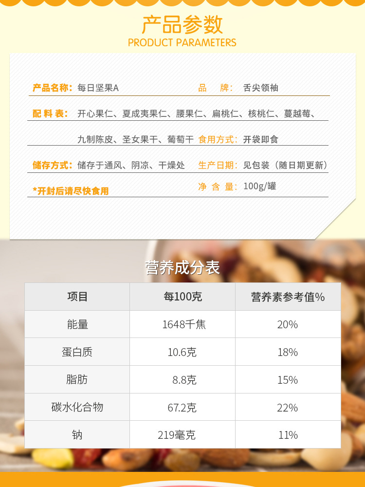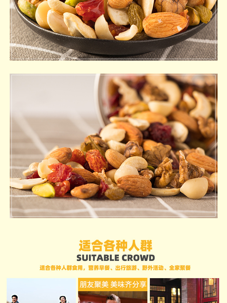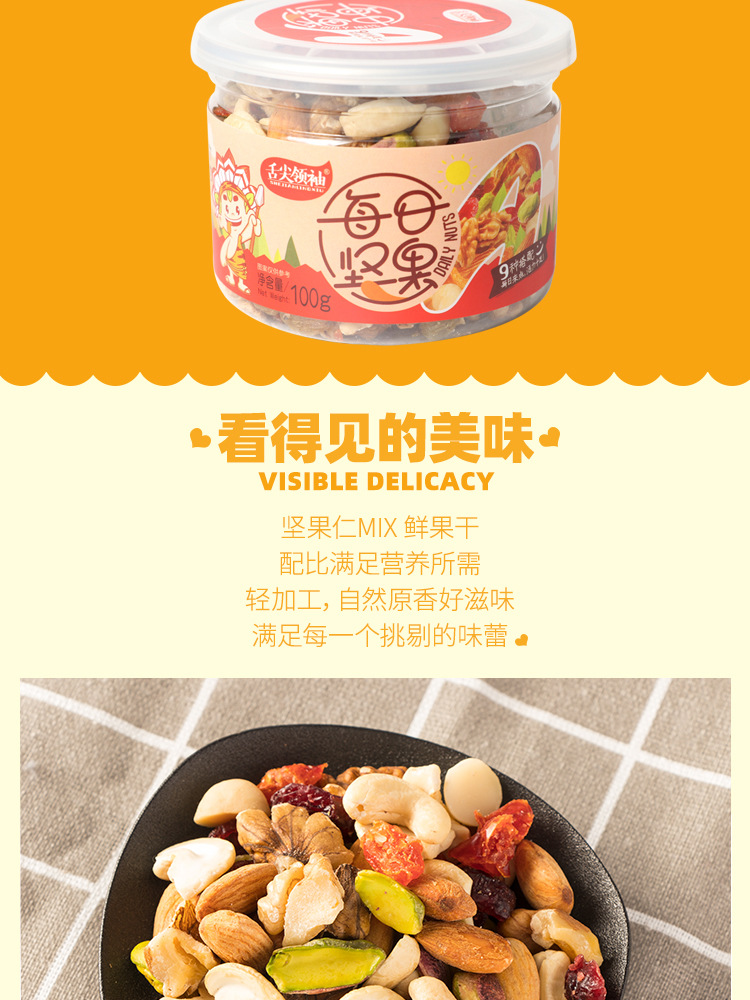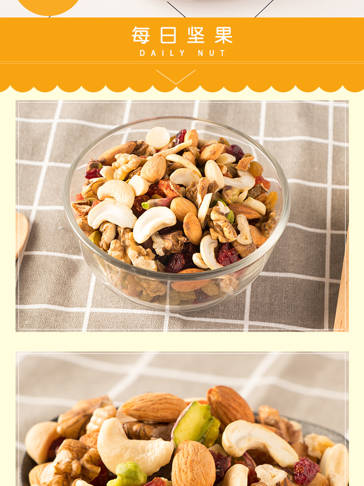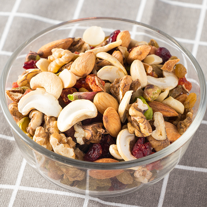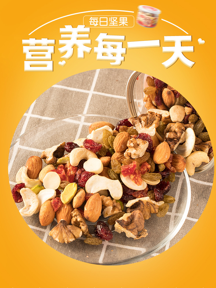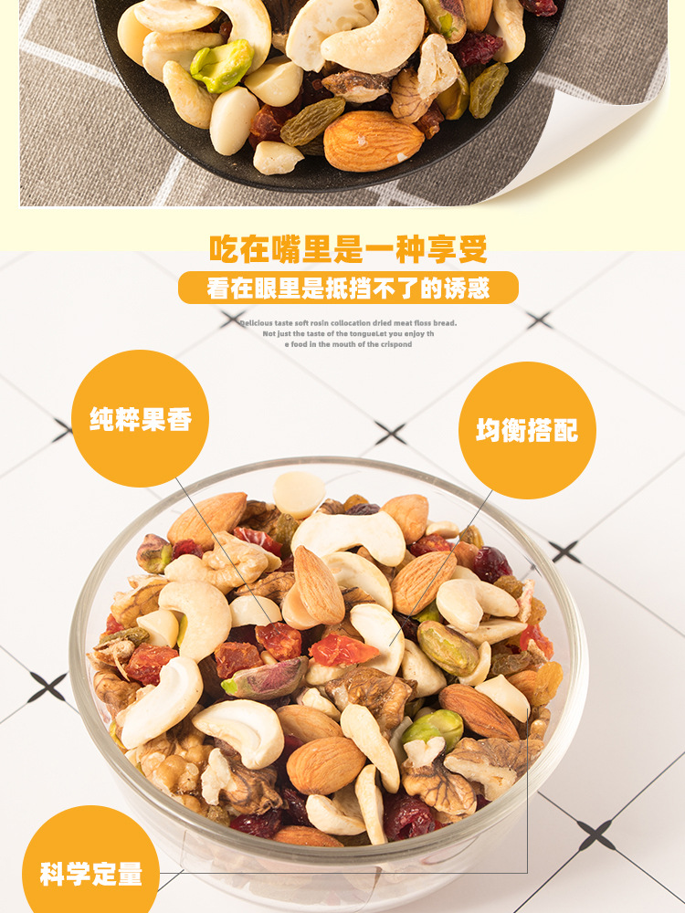 开心果仁、夏威夷果仁、腰果仁、扁桃仁、核桃仁、蔓越莓、九制陈皮、圣女果干、葡萄干