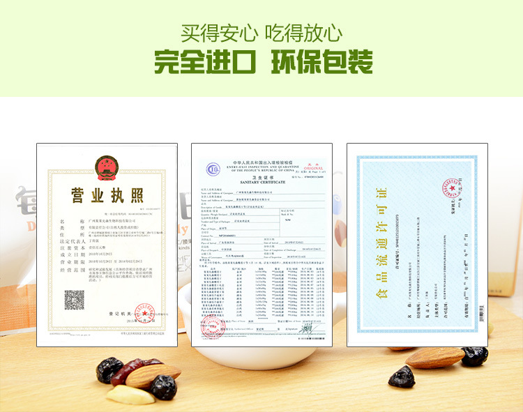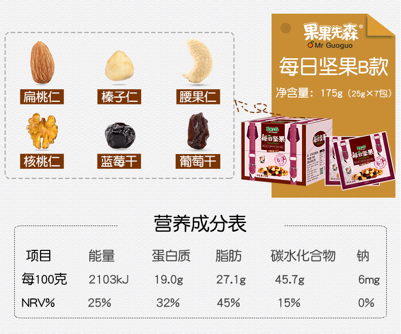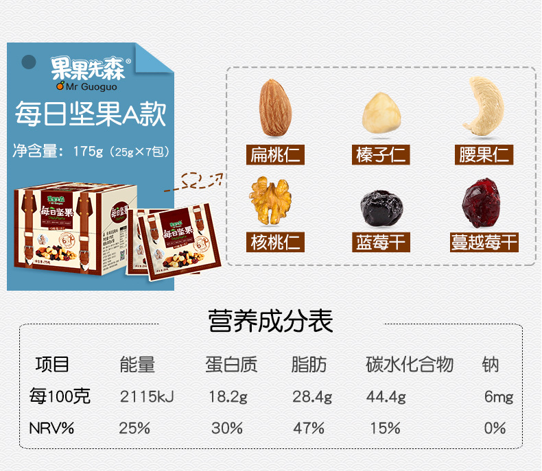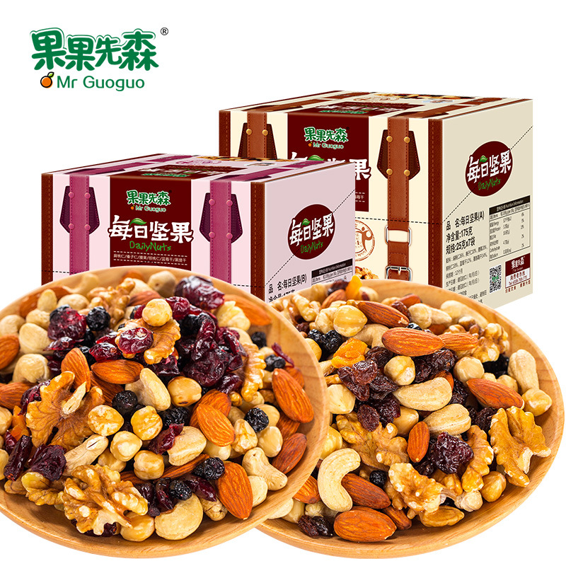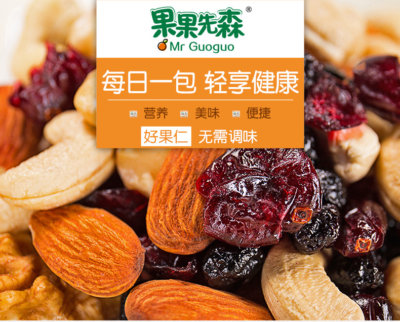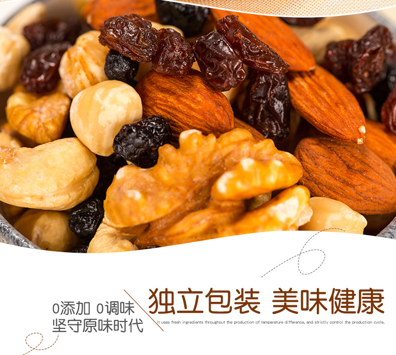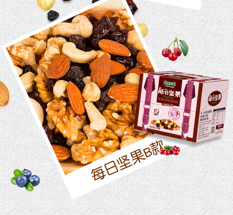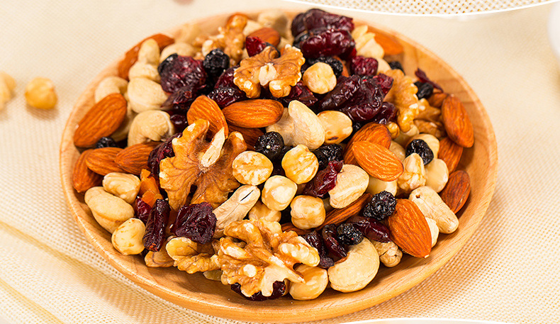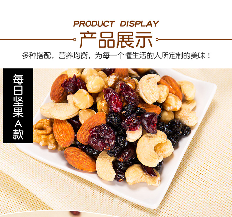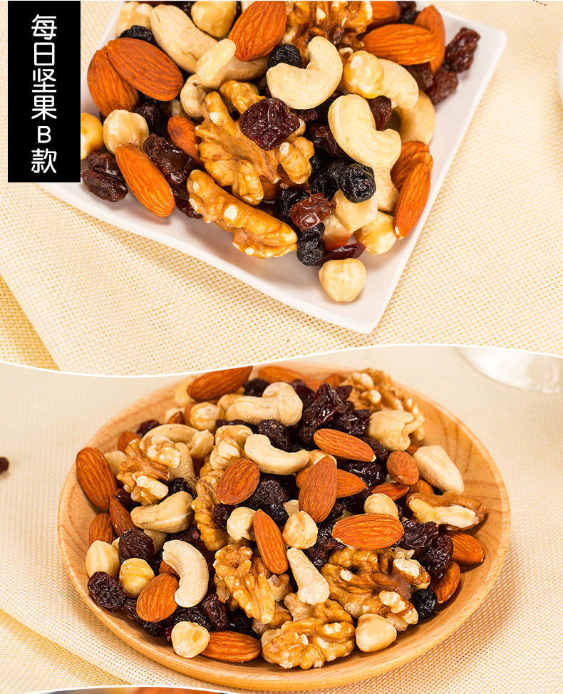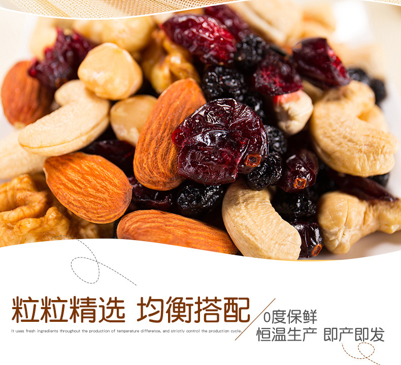 扁桃仁 、腰果、 核桃仁、 榛子仁、 蔓越莓干 、蓝莓干 、黑提干混合坚果