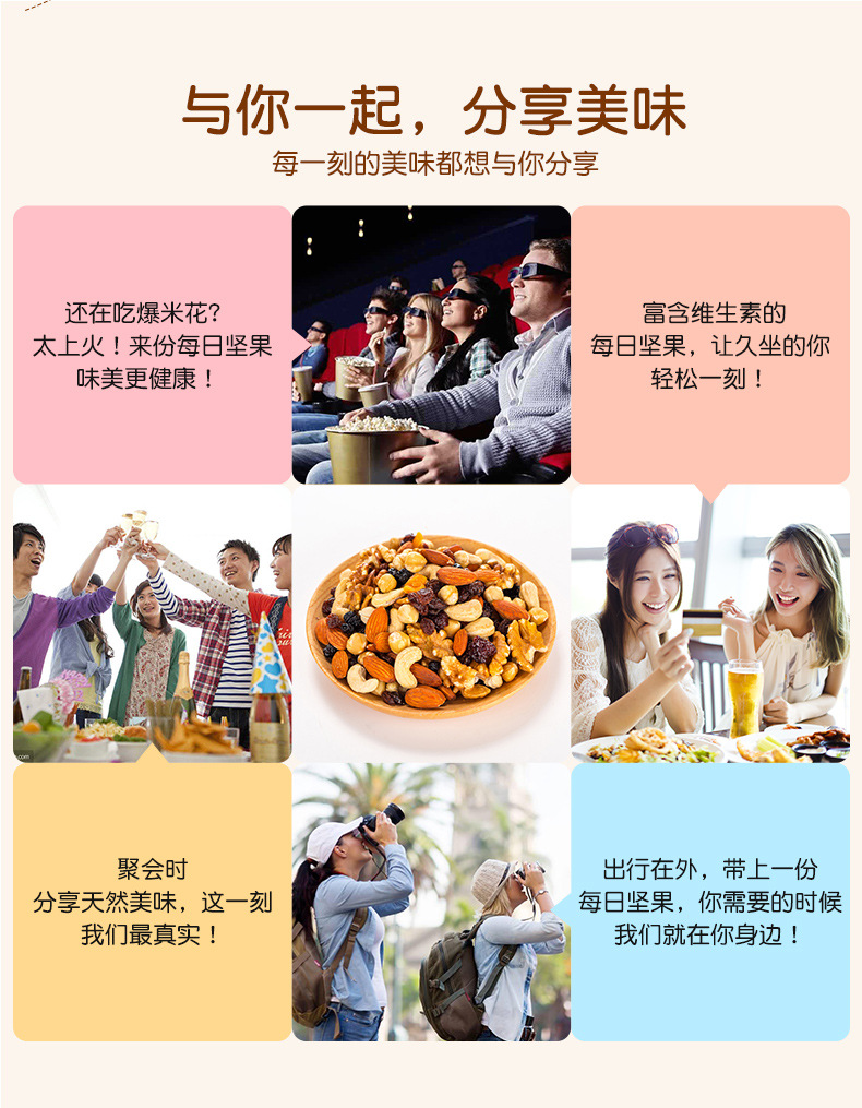 扁桃仁 、腰果、 核桃仁、 榛子仁、 蔓越莓干 、蓝莓干 、黑提干混合坚果--聚爱城