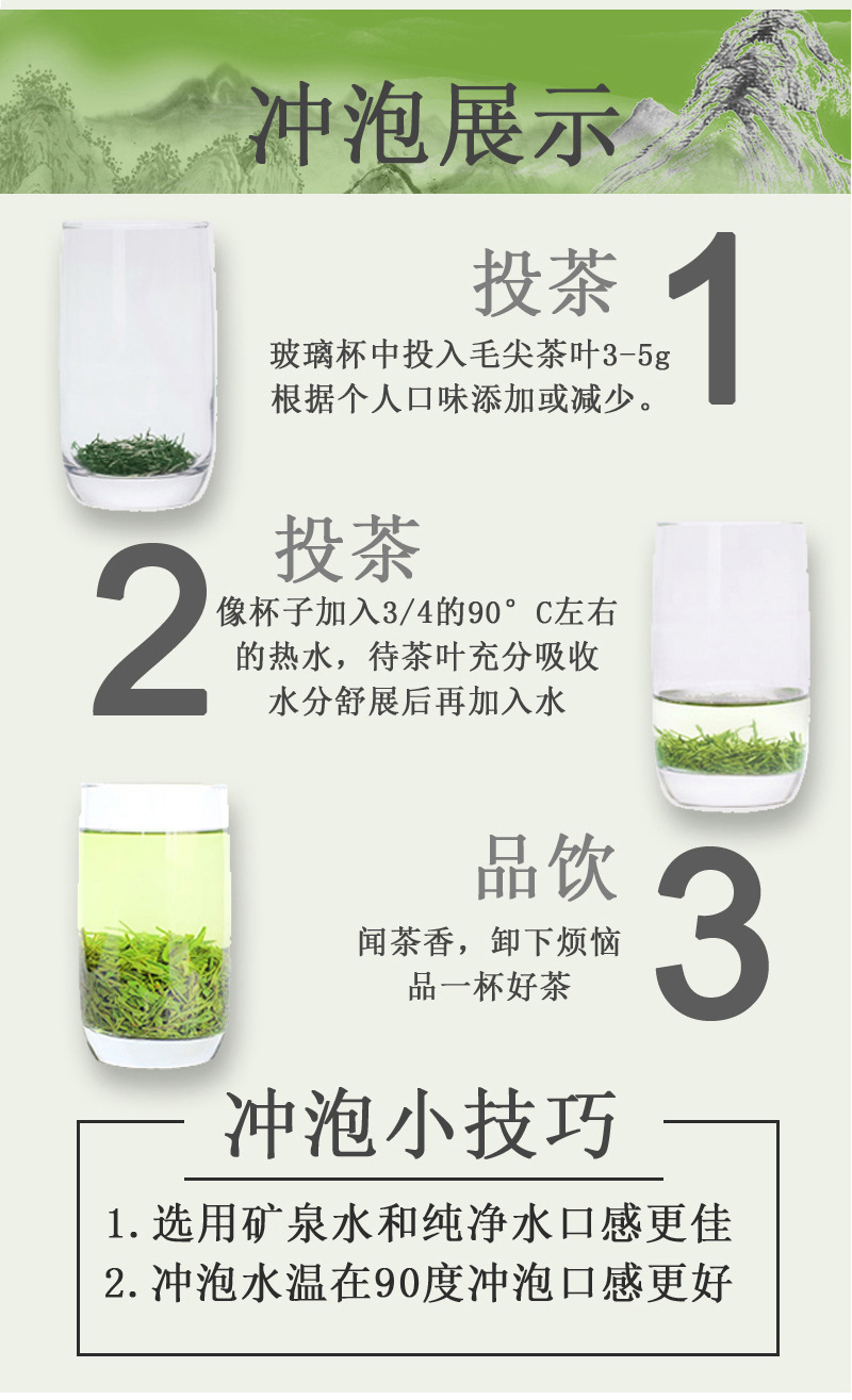 用90度水在杯中导入4分之3,带茶叶冲泡开后,在注水饮用,爽口回甘,香气四溢