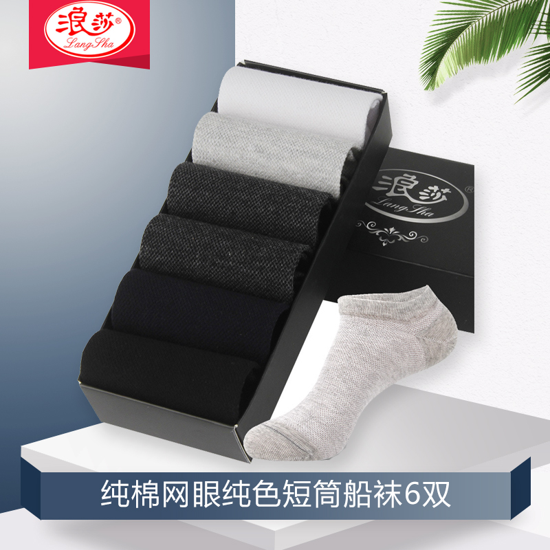 浪莎男士纯棉网眼黑色短筒船袜6双,全网统一价39.90,点评抵金5元